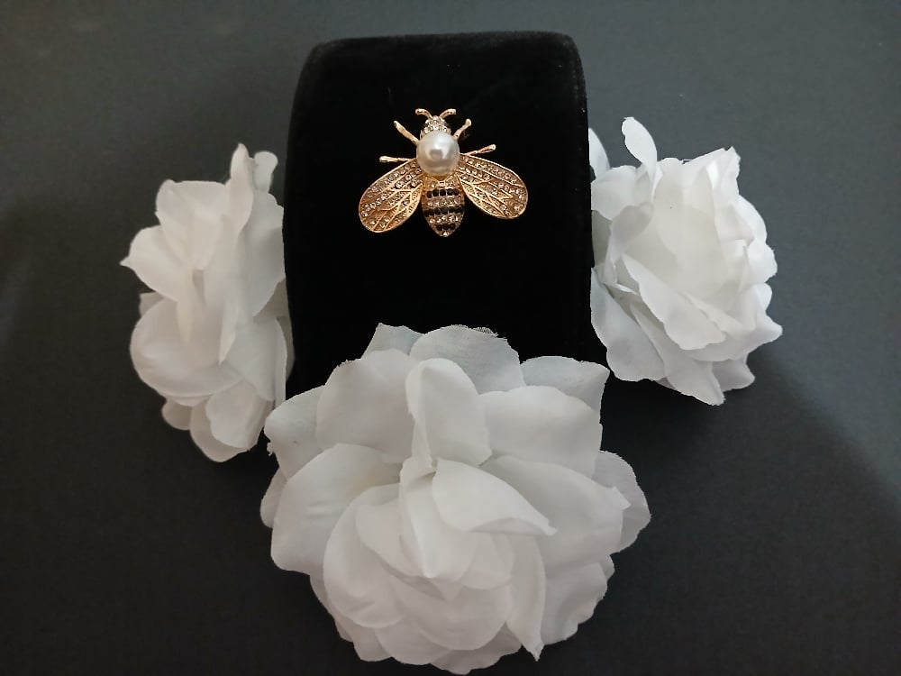 Gold Honey Bee Faux Pearl Fashion Brooch Embellished with Crystals and Black Gems.